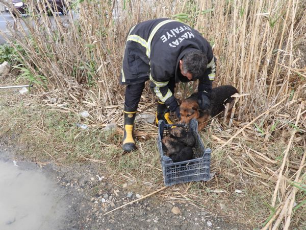 Hatay'ın Samandağ İlçesine bağlı Kapısuyu Mahallesi'nde sazlıkların arasında bir köpeğin havladığını duyan vatandaşlar kontrol ettiklerinde yavrularının su tahliye borusuna sıkıştığını fark etti. Mahallelinin ihbarıyla bölgeye itfaiye ekipleri sevk edildi. Ekipler 30 dakikalık çalışma sonucu, boruya sıkışan 4 yavruyu kurtardı. Islanan köpekler kurutulduktan sonra doğaya bırakıldı.