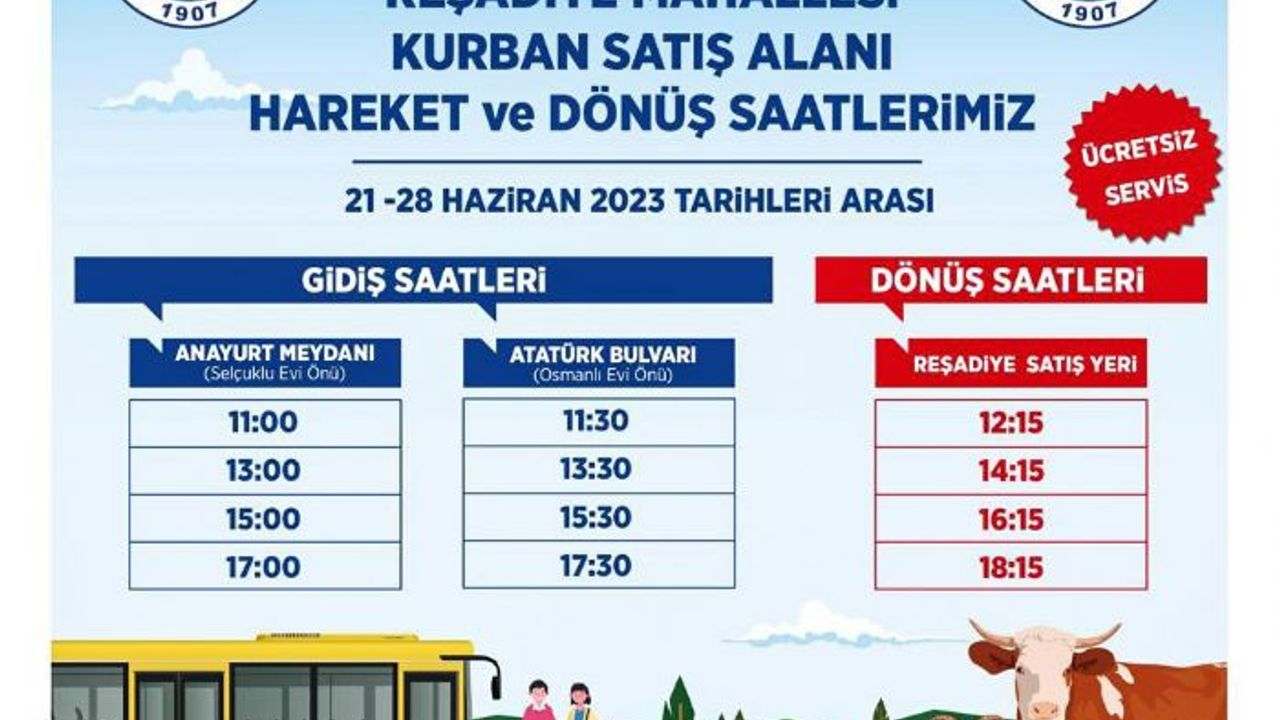 Reşadiye Mahallesi'nde bulunan kurban satış ve kesim yerine 21-28 Haziran tarihleri arasında yapılacak seferlerle kurbanlık alacak vatandaşların ulaşımları kolaylaştırılmış oluyor.