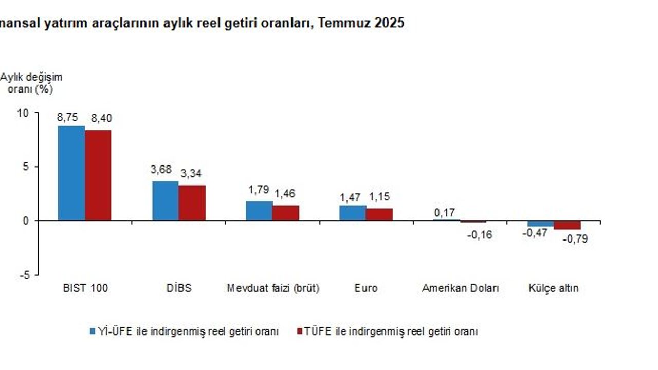 Türkiye İstatistik Kurumu (TÜİK), Temmuz 2025’e ait finansal yatırım araçlarının reel getiri oranlarını açıkladı. Verilere göre, BIST 100 endeksi, temmuz ayında yatırımcısına en yüksek aylık reel getiriyi sağladı. Yurt içi üretici fiyat endeksi (Yİ-ÜFE) ile indirgendiğinde yüzde 8,75, tüketici fiyat endeksi (TÜFE) ile indirgendiğinde ise yüzde 8,40 oranında bir getiri sağladı. Bu oranlar, BIST 100’ü aylık bazda öne çıkaran rakamlar oldu.