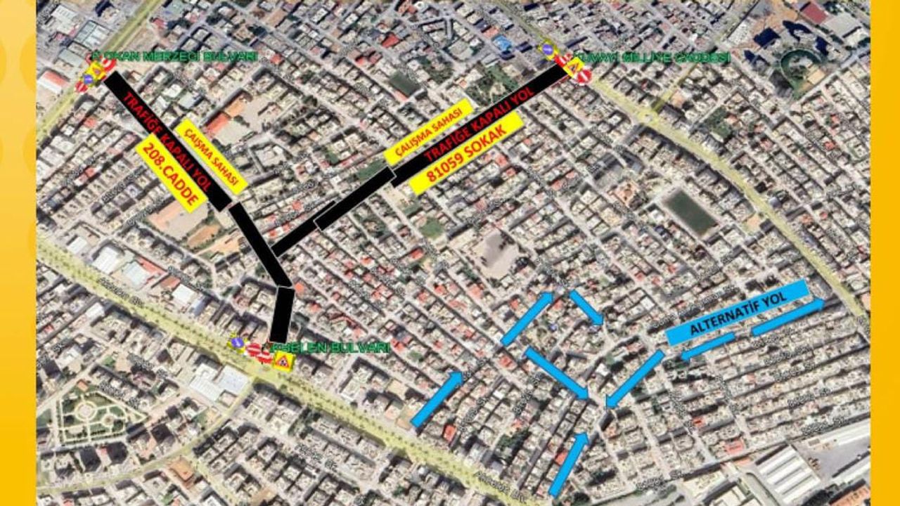Mersin Büyükşehir Belediyesi tarafından Toroslar ilçesinde yürütülecek yol düzenleme çalışması kapsamında Osmaniye ve Zeki Ayan mahallelerinde önemli bir trafik düzenlemesine gidiliyor. Mersin Büyükşehir Belediyesi tarafından yapılan duyuruya göre, 208. Cadde ile 81059 Sokak’ta gerçekleştirilecek çalışmalar nedeniyle krokide belirtilen alan 24 Şubat 2026 Salı günü itibarıyla geçici süreyle trafiğe kapalı olacaktır. Yetkililer, sürücülerin çalışma süresi boyunca trafik işaret ve yönlendirmelerine uymalarını, olası yoğunlukların önüne geçilmesi için alternatif güzergahları kullanmalarını istedi. Çalışmanın, bölgedeki ulaşım konforu ve yol güvenliğini artırmayı amaçladığı belirtildi.