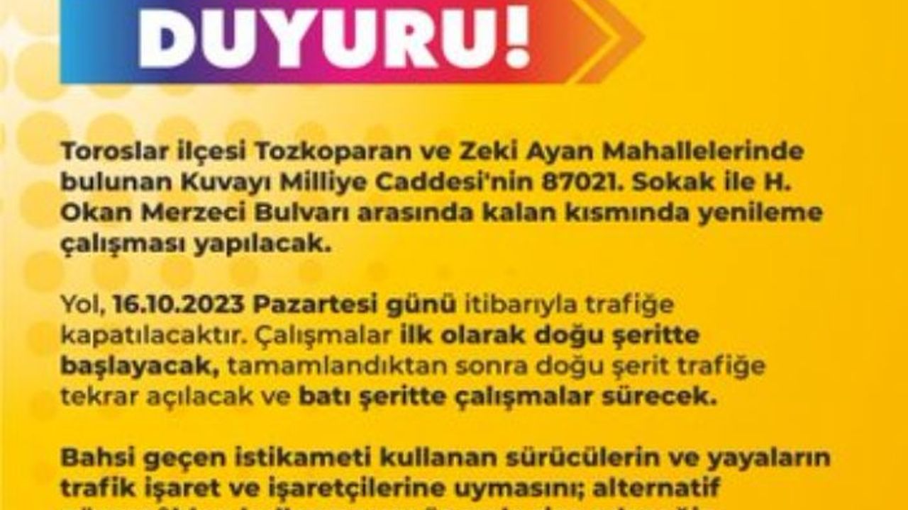 Çalışmalar kapsamında, cadde üzerindeki 87021 Sokak ile H. Okan Merzeci Bulvarı arasındaki bölüm, 16 Ekim 2023 Pazartesi günü trafiğe kapatılacaktır.