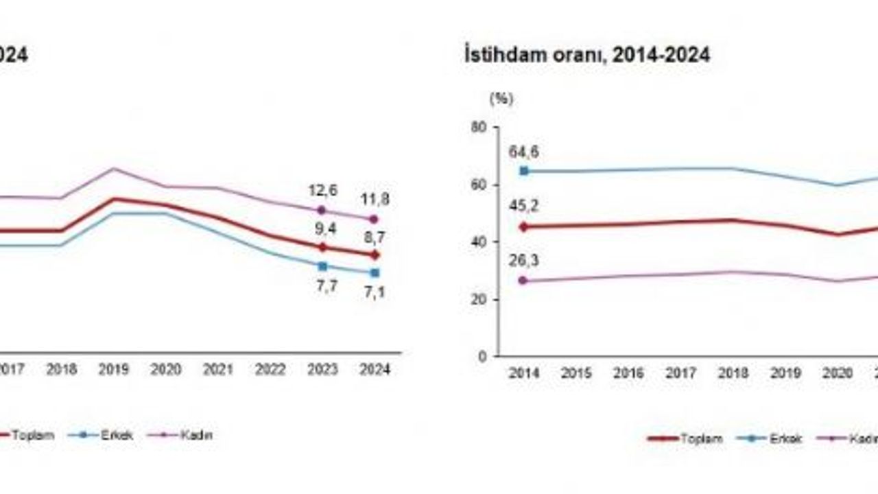 TÜİK, 2024 yılı iş gücü istatistiklerini açıkladı. Buna göre; 15 ve daha yukarı yaştaki kişilerde işsiz sayısı, 2024 yılında bir önceki yıla göre 151 bin kişi azalarak 3 milyon 113 bin kişi oldu. İşsizlik oranı 0,7 puan azalarak yüzde 8,7 seviyesinde gerçekleşti. İşsizlik oranı, erkeklerde yüzde 7,1 iken, kadınlarda yüzde 11,8 olarak gerçekleşti. İstihdam edilenlerin sayısı, 2024 yılında bir önceki yıla göre 988 bin kişi artarak 32 milyon 620 bin kişi, istihdam oranı ise 1,2 puan artarak yüzde 49,5 oldu. Bu oran erkeklerde yüzde 66,9 iken, kadınlarda yüzde 32,5 olarak gerçekleşti. İş gücü 2024 yılında bir önceki yıla göre 837 bin kişi artarak 35 milyon 733 bin kişi, iş gücüne katılma oranı ise 0,9 puan artarak yüzde 54,2 olarak gerçekleşti. İş gücüne katılma oranı erkeklerde yüzde 72, kadınlarda ise yüzde 36,8 oldu.