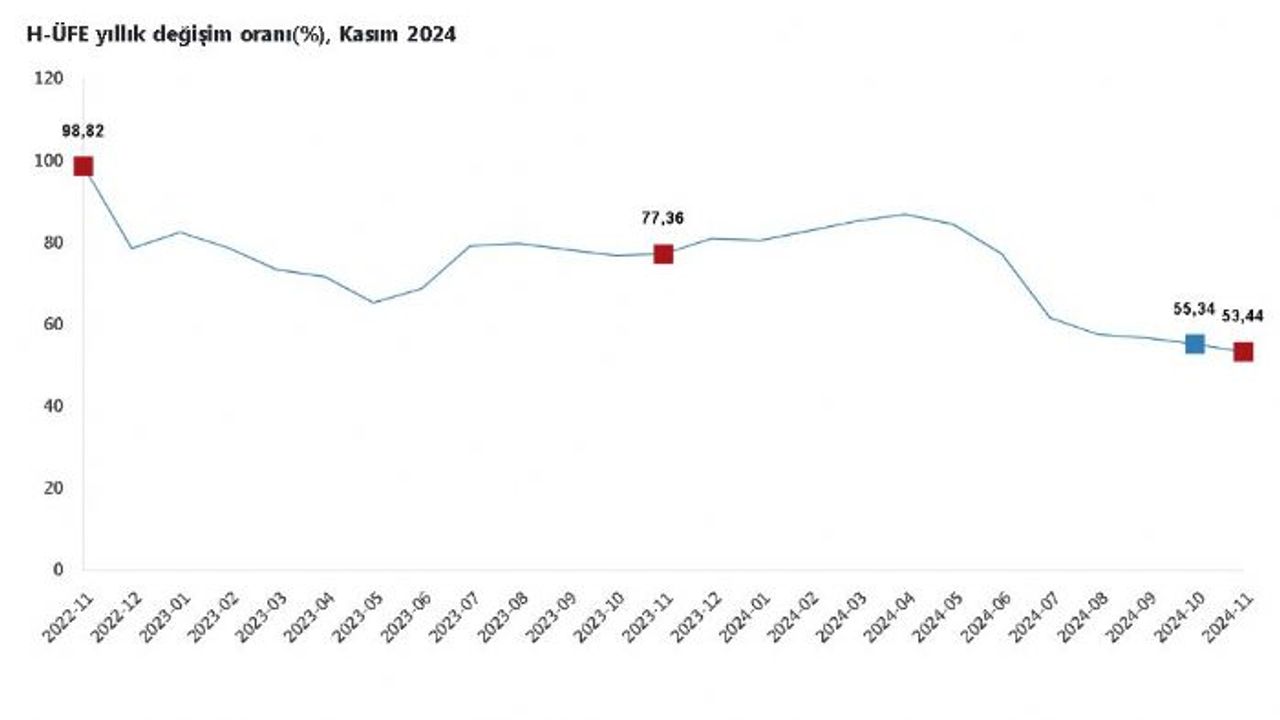 TÜİK, Kasım 2024 dönemine ilişkin hizmet üretici fiyat endeksi verilerini açıkladı. Buna göre; hizmet üretici fiyatları bir önceki aya göre yüzde 0,76 azaldı, bir önceki yılın aralık ayına göre yüzde 48,12, bir önceki yılın aynı ayına göre yüzde 53,44 ve 12 aylık ortalamalara göre yüzde 69,81 arttı.