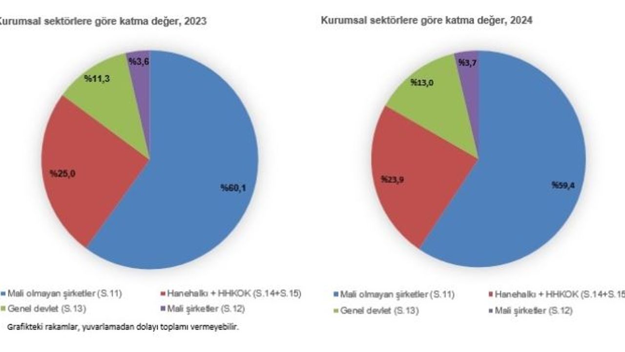 Rapor, ekonomide en yüksek katma değeri sağlayan sektörün mali olmayan şirketler olduğunu ortaya koydu. Bu sektörün toplam katma değer içindeki payı 2024 yılında yüzde 59,4 olarak kaydedildi. Mali olmayan şirketleri hanehalkı, hanehalkına hizmet veren kar amacı gütmeyen kuruluşlar (HHKOK) ve genel devlet sektörü izledi.