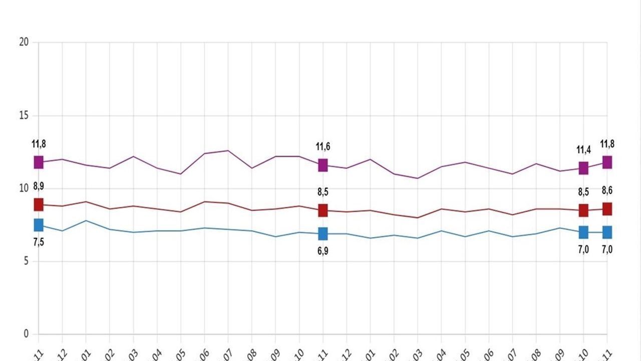 TÜİK, Kasım 2025 dönemine ilişkin iş gücü istatistiklerini açıkladı. Buna göre; 15 ve daha yukarı yaştaki kişilerde işsiz sayısı 2025 yılı Kasım ayında bir önceki aya göre 54 bin kişi artarak 3 milyon 98 bin kişi oldu. İşsizlik oranı 0,1 puan artarak yüzde 8,6 seviyesinde gerçekleşti. İşsizlik oranı erkeklerde yüzde 7 iken, kadınlarda yüzde 11,8 olarak tahmin edildi. İstihdam edilenlerin sayısı 2025 yılı Kasım ayında bir önceki aya göre 75 bin kişi artarak 32 milyon 737 bin kişi, istihdam oranı 0,1 puan artarak yüzde 49,2 oldu. Bu oran erkeklerde yüzde 66,8 iken, kadınlarda yüzde 31,9 olarak gerçekleşti. İşgücü, 2025 yılı Kasım ayında bir önceki aya göre 128 bin kişi artarak 35 milyon 834 bin kişi, işgücüne katılma oranı ise 0,1 puan artarak yüzde 53,8 olarak gerçekleşti. İşgücüne katılma oranı erkeklerde yüzde 71,8 iken, kadınlarda yüzde 36,2 oldu.