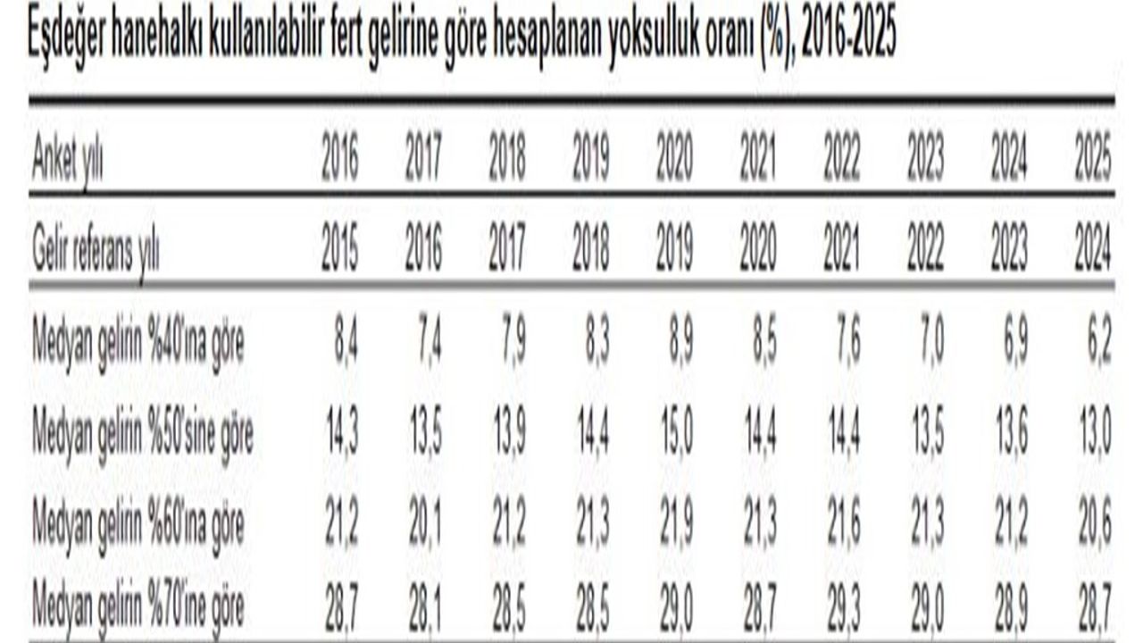 TÜİK, 2025 yılına ilişkin, 'Yoksulluk ve Yaşam Koşulları İstatistikleri'ni açıkladı. Eş değer hanehalkı kullanılabilir fert medyan gelirinin yüzde 50'si dikkate alınarak belirlenen yoksulluk sınırına göre hesaplanan göreli yoksulluk oranı, 2025 yılında bir önceki yıla göre 0,6 puan azalarak yüzde 13 oldu. Medyan gelirin yüzde 60'ı dikkate alınarak belirlenen yoksulluk sınırına göre hesaplanan yoksulluk oranı ise yine 0,6 puan azalarak yüzde 20,6 olarak gerçekleşti. Eş değer hanehalkı kullanılabilir fert medyan gelirinin yüzde 40'ı dikkate alınarak belirlenen yoksulluk sınırına göre yoksulluk oranı, bir önceki yıla göre 0,7 puanlık azalış ile yüzde 6,2 olarak gerçekleşti. Medyan gelirin yüzde 70'i dikkate alınarak belirlenen yoksulluk sınırına göre hesaplanan yoksulluk oranı ise bir önceki yıla göre 0,2 puanlık azalış ile yüzde 28,7 oldu.
