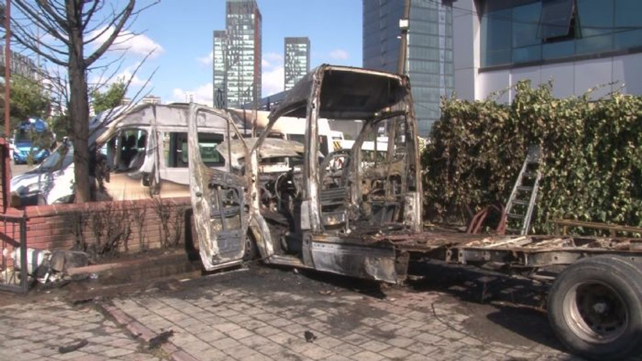 Ümraniye'de iş yerinin önündeki iki minibüs alevlere teslim oldu
