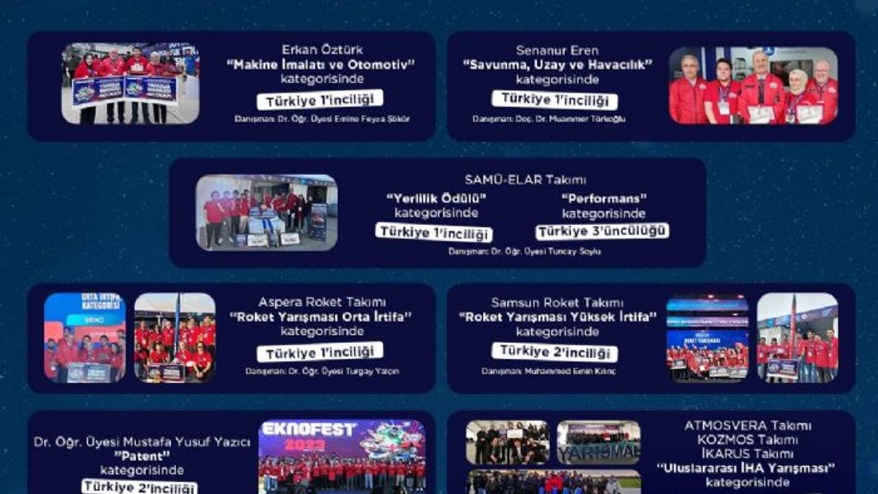 "Makine İmalatı ve Otomotiv Kategorisi'nde Türkiye birinciliği ödülünü Makine Mühendisliği Bölümü öğrencisi Erkan Öztürk ve Danışman Dr. Öğr. Üyesi Emine Feyza Şükür kazandı. Savunma Uzay ve Havacılık Kategorisi'nde Türkiye birinciliğini Yazılım Mühendisliği Bölümü Öğrencisi Sena Nur Eren ve Danışmanı Doç. Dr. Muammer Türkoğlu kazandı. Elektrikli Araç Kategorisi'nde yerlilik dalında Türkiye birinciliğini, performans dalında ise Türkiye üçüncülüğünü takım danışmanı Dr. Tuncay Soylu, takım üyeleri Bilgehan Kasım, Talip Savma, Tarık Cemil Başak, Asude Rana Çakar, Umut Kaymak, Ayçe Gülüm Saltık, Yusuf Ağlar, Yunus Emre Taşdelen, Emre Mertcan, Mustafa Emre Seyhan, Asıf Varol kazandı. Roket Yarışması Orta İrtifa Kategorisi'nde Türkiye birinciliğini Takım Danışmanı Dr. Öğr. Üyesi Turgay Yalçın, takım üyeleri Fatih Kılınçarslan, Beyza Yavuz, Zeynep Kuru, Tuba Ayyıldız, Nagehan Akın, Şeyma Aydoğan, Cihan Dağdagül, Sefa Şahin, Mehmet Efe Baysal, Yusuf Karaböcek; Roket Yarışması Yüksek İrtifa Kategorisi'nde Türkiye ikinciliğini Takım Danışmanı Muhammed Emin Kılınç ile takım üyeleri Hasan Emre Öztürk, Emin Bayram, Serdar Koçan, Sefa Yılmaz, Gökberk Akyürek, Zehra Sena Şentürk, Beytullah Kırcı; Patent Kategorisi'nde Türkiye ikinciliğini Makina Mühendisliği Bölümü Dr. Öğr. Üyesi Dr. Mustafa Yusuf Yazıcı, Uluslararası İnsansız Hava Aracı (İHA) Yarışması Kategorisi'nde performans ödülünü ATMOSVERA takımı üyeleri Muhammet Orkun Paşaoğlu, Gülsüm Demir, Mehmet Efe Baysal, Arif Emin Köklü, Zeynep Aktürk Mert Can Yılmaz, Ruşen Çıkar, Zeynep Özbayrak, KOZMOS takımı üyeleri Tahir Çebi, Mehmet Yalpı, Duygu Bayburtlu, Muhammed Oktay Yamal, Eren Doğan, Fatih Büyükbeşe, Mehmet Yiğit Kılıçaslan ve Edanur Köroğlu ve İKARUS takımı üyeleri Emre Yıldız, Muhammed Güven Zengin, Zehra Demirci, Rabia Tosun, Bayram Eren Gündüz, Emine Sefa Türkoğlu, Yasemin Afacan, Muhammed Mustafa Karakaş kazandı. Girişim Yarışması-Çevre, Enerji ve İklim Teknolojileri Kategorisi'nde ise En İyi Girişim Ödülü'nü Makine Mühendisliği Bölümü Dr. Öğr. Üyesi Mustafa Yusuf Yazıcı ve Araş. Gör. Sare Mıtıncık aldı."