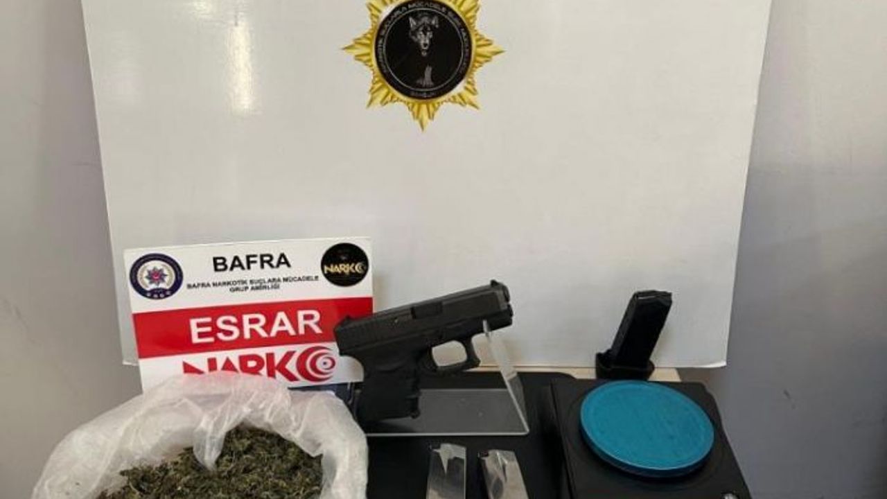 Bafra Cumhuriyet Başsavcılığı'nın koordinesinde Bafra Natkotik Büro Amirliği ekiplerince yapılan çalışmalar sonucunda F.G. ve C.C. isimli şahısların aracında ve Yaka Mahallesi'ndeki ikametinde yapılan aramalarda 44 gram esrar, 1 adet hassas terazi, 1 adet ruhsatsız tabanca ile 49 adet tabanca fişeği ele geçirildi.