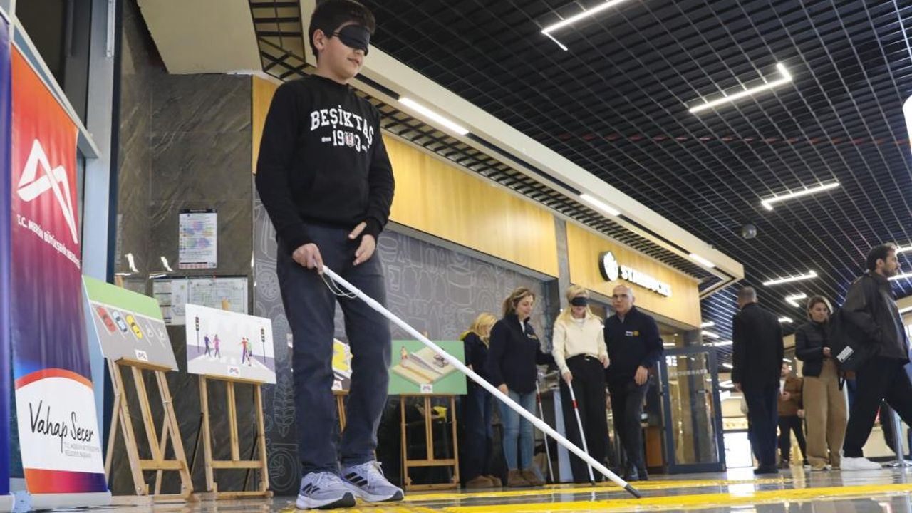 Büyükşehir Belediyesi Sağlık İşleri Dairesi Başkanlığı ile bir sivil toplum örgütü iş birliğinde gerçekleştirilen etkinlikte, hissedilebilir yüzeyden oluşan parkurda yürüyen vatandaşlar, görme engelli bireylerin günlük hayatta yaşadığı güçlükleri birebir yaşama fırsatı buldu.