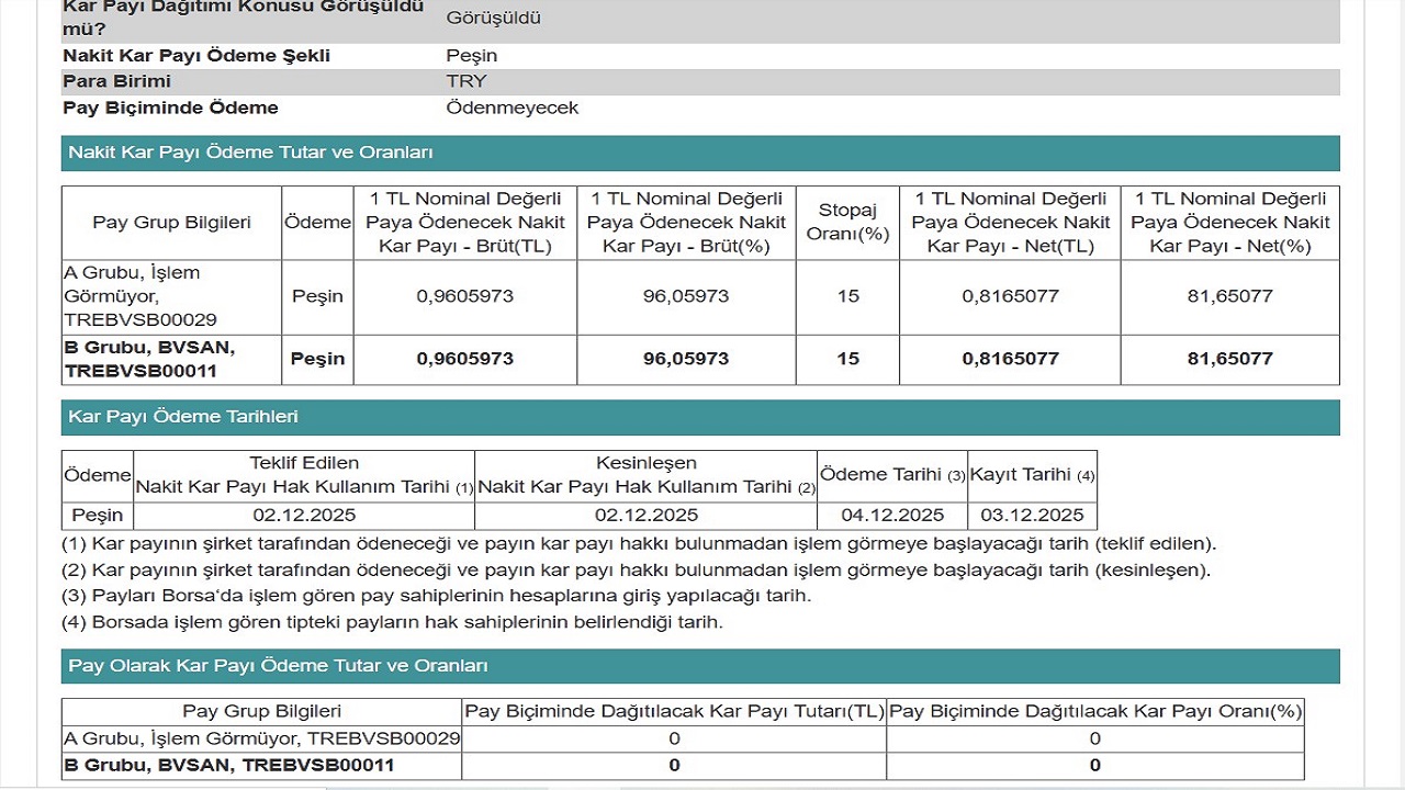 Temettü ödemesinin gerçekleştirilmesi ile birlikte BVSAN pay fiyatında kar payı tutarı kadar düzeltme gerçekleşecek.