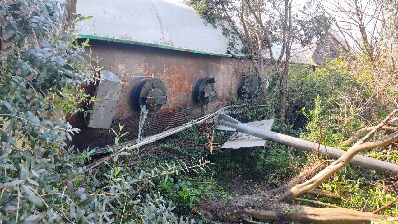 Hatay'da dönüş yaptığı esnada devrilen tankerin portakal bahçesine uçtuğu anlar araç kamerasına yansıdı.