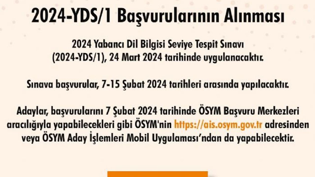 Sınava ilişkin ayrıntılı bilgi 2024-YDS/1 Kılavuzu'nda yer alıyor. Adaylar, kılavuza https://osym.gov.tr adresinden erişebilecek. 24 Mart 2024 tarihinde uygulanacak sınavın sonuçlarının ise 25 Nisan'da açıklanması bekleniyor.