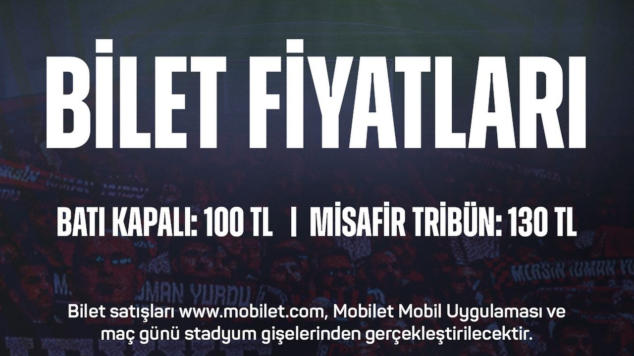 Kulüpten yapılan açıklamada, "Batı kapalı 100, misafir tribün 130 TL'den satışa çıkmıştır. Bilet satışları mobilet internet sitesi ile mobilet mobil uygulaması ve maç günü stadyum gişelerinden gerçekleştirilecektir. Turnike bölümünde yoğunluk yaşanmaması adına kağıt biletinizde, PDF bilet üzerinde veya mobilet cüzdanda bulunan QR kodu okutarak direkt giriş sağlayabiliriz" ifadeleri kullanıldı.