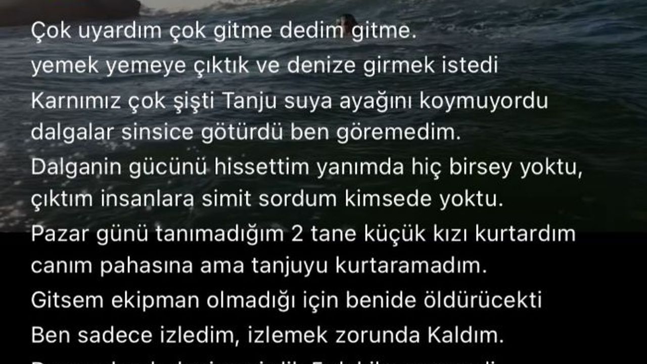 Arkadaşının suda kaybolmadan önce son kez kafasını kaldırıp kendisine baktığını sözlerine ekleyen Serdar Akça, "Tanju'nun zihinsel engeli var. Buna rağmen yüzmeyi çok olmasa da biliyor. Su yutunca panik oldu. Ters akıntıya karşı mulaç atamayınca pes etmek zorunda kaldı. Kafasını kaldırıp son kez bana baktıktan sonra kendisini denize bıraktı. Cesedinin başında bekleyip saatlerce ağladım" diye konuştu. Akça arkadışının ölümünün ardından yaşadıklarını sosyal medya hesabından da paylaştı.