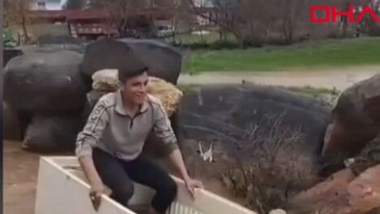 Kentte, 3 gün boyunca etkili olan sağanak yaşamı olumsuz etkiledi. Birçok yerde tarım arazileri ve yollar taşan suyla göle döndü. Kızıltepe ilçesi Kırsal Dikmen Mahallesi’nde de yola dolan suyu eğlenceye çeviren bir kişi, hurda buzdolabı kasası ile ilerledi. O anlar cep telefonu kamerasıyla görüntülendi. Sanal medyada paylaşılan görüntüler beğeni topladı.