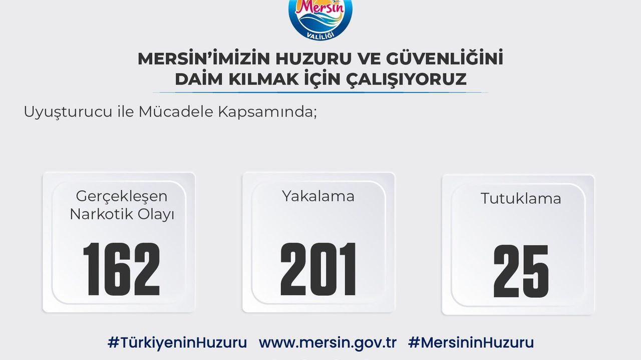 Mersin Valiliği tarafından paylaşılan bilgilere göre, bir hafta içerisinde 162 narkotik olayı meydana geldi. Gerçekleştirilen operasyonlarda 201 şüpheli şahıs yakalanırken, bunlardan 25’i çıkarıldıkları mahkemece tutuklandı. Şüpheli şahısların ikametlerinde, iş yerlerinde ve araçlarında yapılan aramalarda bin 632 adet uyuşturucu hap, 48 kilo 42 gram uyuşturucu madde ele geçirildi.