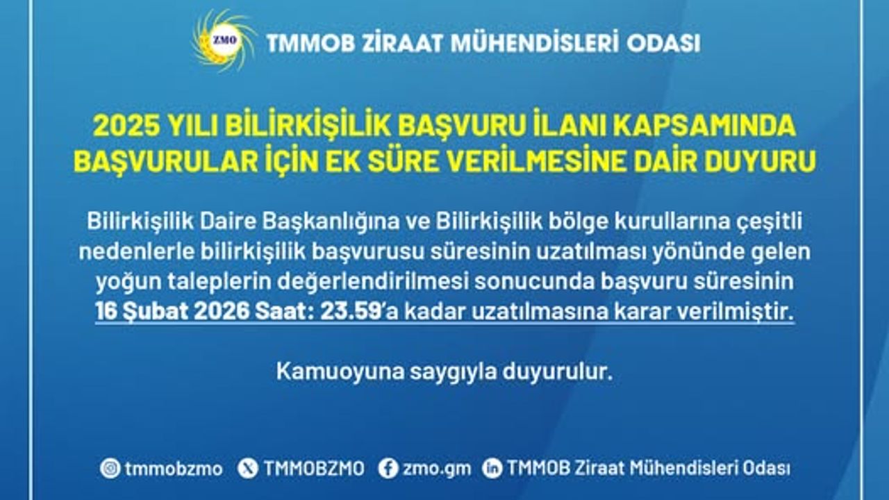 Bilirkişi olmak isteyen ancak sistemsel yoğunluk ya da belge toplama süreci nedeniyle başvurularını yetiştiremeyen meslek mensuplarının talepleri karşılık buldu. Ziraat Mühendisleri Odası, üyelerinin mağduriyet yaşamaması adına bu süreci yakından takip ederek uzatma kararını kamuoyuyla paylaştı.