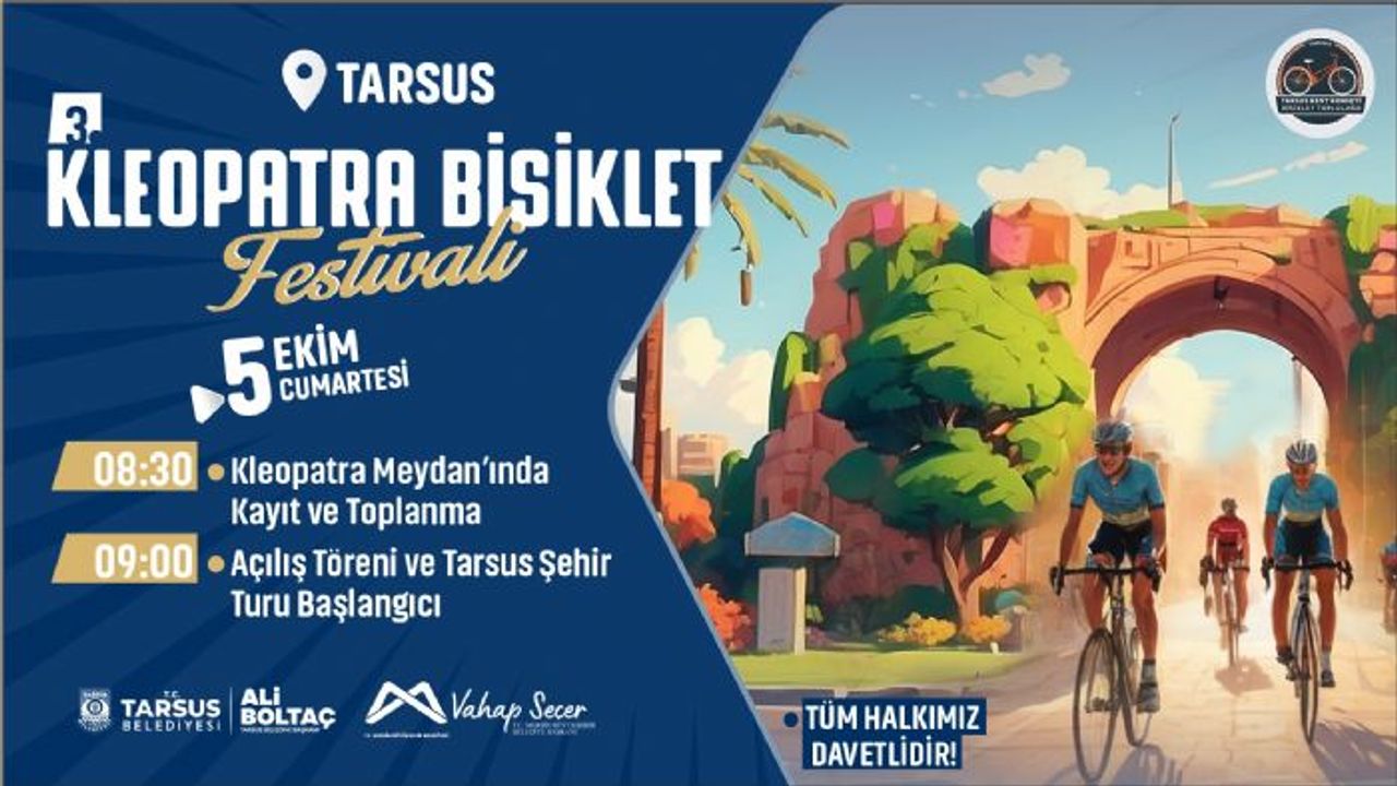 Mersin Büyükşehir Belediyesi, Tarsus Belediyesi ve Tarsus Bisiklet Topluluğu iş birliğiyle bu yıl üçüncüsü düzenlenecek olan Kleopatra Bisiklet Festivali, 4-5-6 Ekim tarihlerinde Tarsus'ta gerçekleştirilecek.