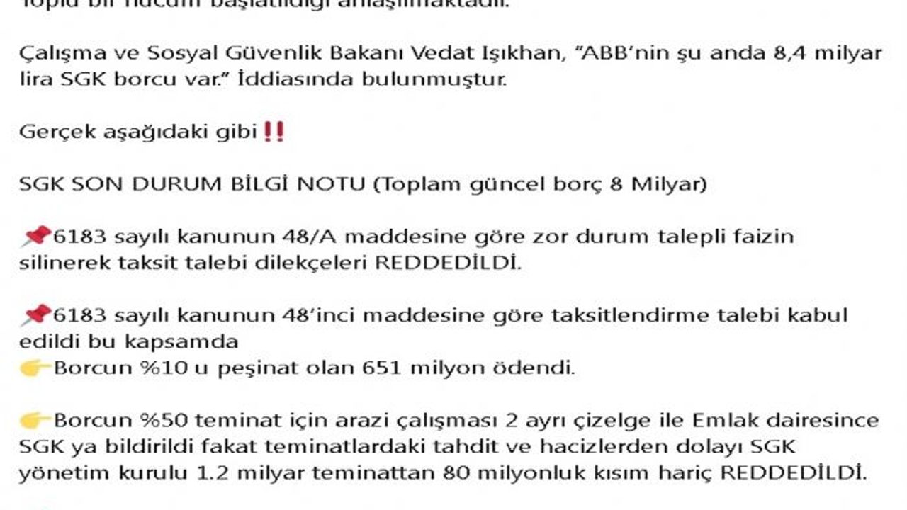 Bunun üzerine sosyal medya hesabından açıklama yapan Yavaş, "Toplu bir hücum başlatıldığı anlaşılmaktadır. SGK son durum bilgi notu (Toplam güncel borç 8 Milyar) 6183 sayılı kanunun 48/A maddesine göre zor durum talepli faizin silinerek taksit talebi dilekçeleri reddedildi. 6183 sayılı Kanun'un 48'inci maddesine göre taksitlendirme talebi kabul edildi bu kapsamda borcun yüzde 10'u peşinat olan 651 milyon ödendi. Borcun yüzde 50 teminat için arazi çalışması iki ayrı çizelge ile emlak dairesince SGK'ya bildirildi fakat teminatlardaki tahdit ve hacizlerden dolayı SGK yönetim kurulu 1,2 milyar teminattan 80 milyonluk kısım hariç reddedildi. Son yapılan görüşmelerde ilgili kanunun 48'nci maddesi yerine dilekçe ile iptali ve karşılıklı rızaen anlaşma ile tüm şirketler için 250 milyon rızaen karşılıklı ödeme konusunda mutabık kalındı" ifadelerini kullandı.