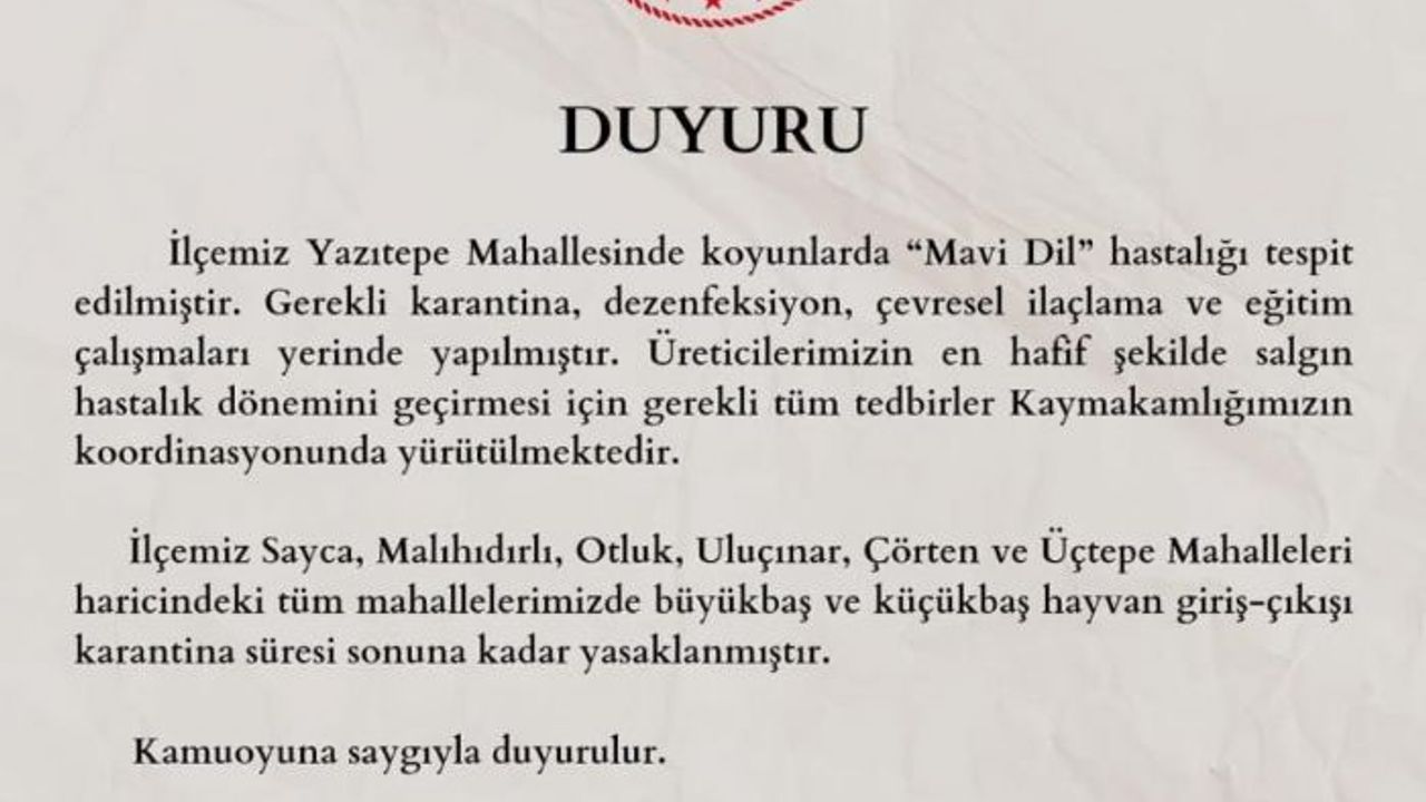 Açıklamada, "Yazıtepe Mahallesi, hayvanlarda görülen mavi dil hastalığı nedeni ile karantina kararı alındı. Yazıtepe Mahallesi yakınında bulunan mahallelere karantina boyunca hayvan giriş çıkışları yasaklandı. Mahallede dezenfeksiyon, çevresel ilaçlama ve gerekli eğitim çalışmaları yapıldı" denildi.