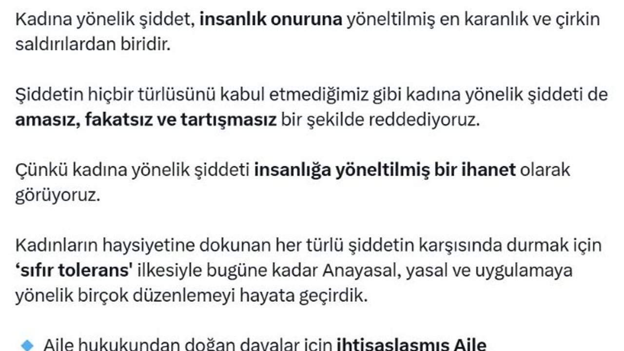 Bakan Tunç, sosyal medya hesabından '25 Kasım Kadına Yönelik Şiddete Karşı Uluslararası Mücadele Günü' nedeniyle yaptığı açıklamada, "Kadına yönelik şiddet, insanlık onuruna yöneltilmiş en karanlık ve çirkin saldırılardan biridir. Şiddetin hiçbir türlüsünü kabul etmediğimiz gibi kadına yönelik şiddeti de amasız, fakatsız ve tartışmasız bir şekilde reddediyoruz. Çünkü kadına yönelik şiddeti insanlığa yöneltilmiş bir ihanet olarak görüyoruz. Kadınların haysiyetine dokunan her türlü şiddetin karşısında durmak için 'sıfır tolerans' ilkesiyle bugüne kadar Anayasal, yasal ve uygulamaya yönelik birçok düzenlemeyi hayata geçirdik. Aile hukukundan doğan davalar için ihtisaslaşmış Aile Mahkemelerinin kurulmasını sağladık" dedi.