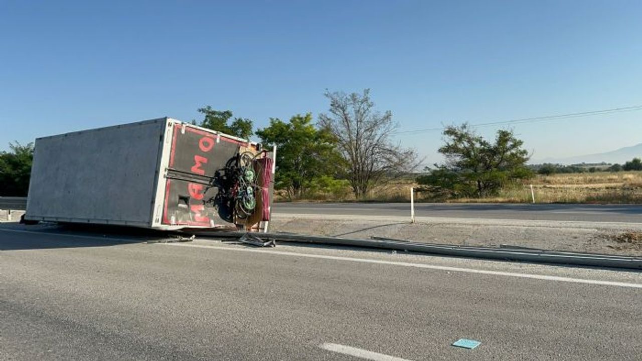 Bariyerleri yıkıp refüje devrilen kamyonda 4 kişi yaralandı