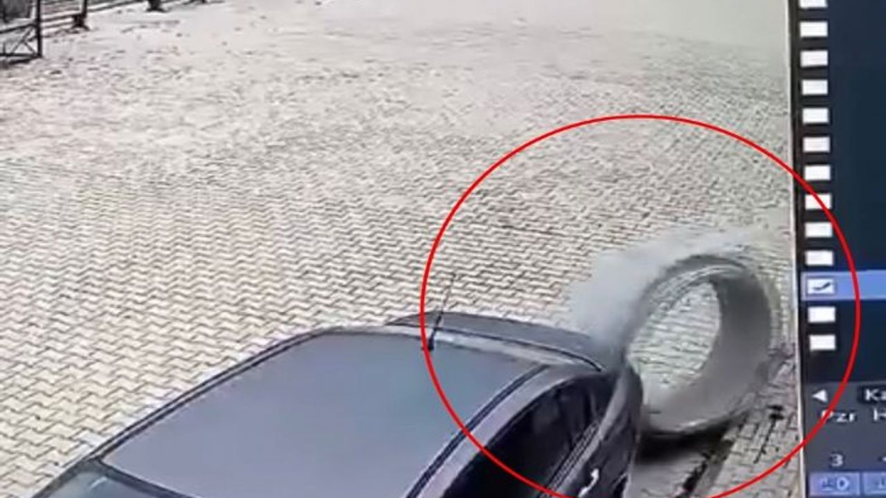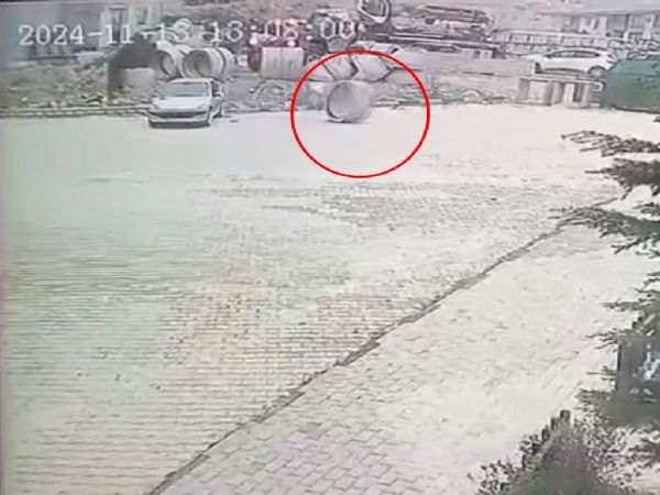 İnşaat alanında, altyapı için kullanılan beton su borusu, hafif meyilli alanda kendiliğinden hareketlenerek, inşaat yakınında bulunan bir sitenin otoparkında park halinde otomobile çarptı. Otomobilde maddi hasar meydana gelirken, o anlar sitenin güvenlik kamerasına yansıdı.