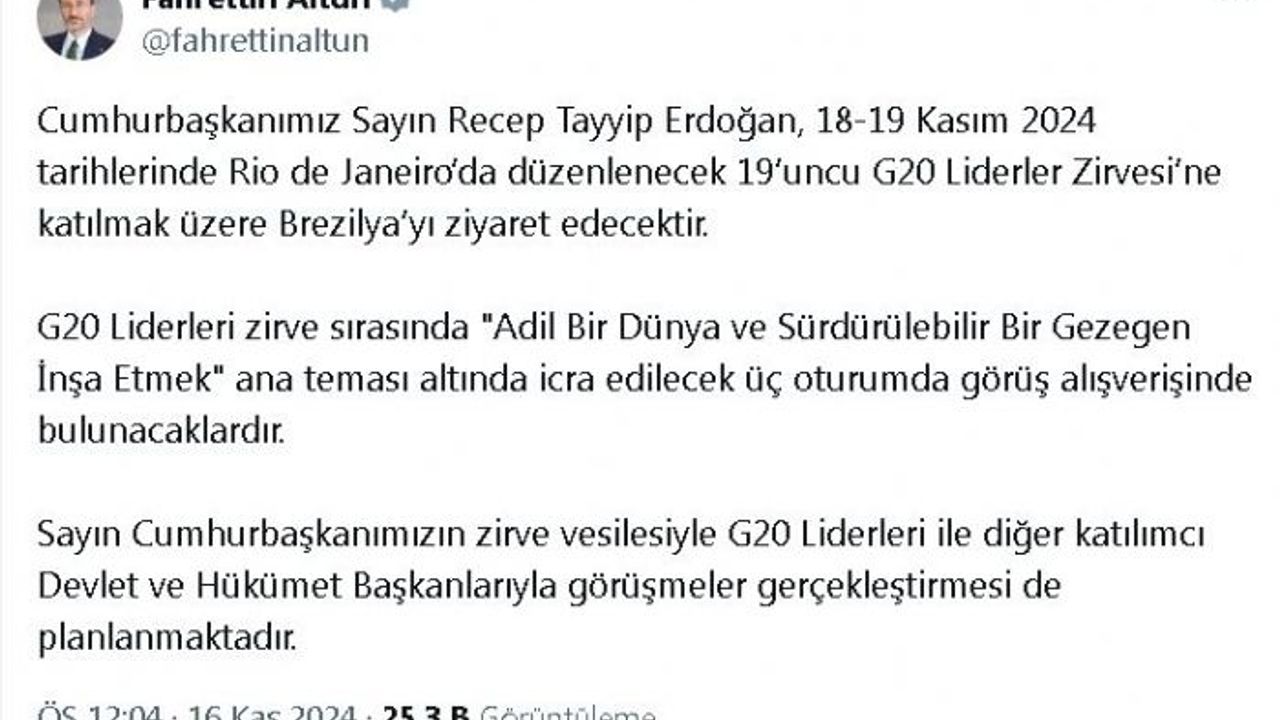 İletişim Başkanı Fahrettin Altun, sosyal medya hesabından yaptığı açıklamada, "Cumhurbaşkanımız Sayın Recep Tayyip Erdoğan, 18-19 Kasım 2024 tarihlerinde Rio de Janeiro'da düzenlenecek 19'uncu G20 Liderler Zirvesi'ne katılmak üzere Brezilya'yı ziyaret edecektir. G20 Liderleri, zirve sırasında 'Adil bir dünya ve sürdürülebilir bir gezegen inşa etmek' ana teması altında icra edilecek 3 oturumda görüş alışverişinde bulunacaklardır. Sayın Cumhurbaşkanımızın zirve vesilesiyle G20 Liderleri ile diğer katılımcı devlet ve hükümet başkanlarıyla görüşmeler gerçekleştirmesi de planlanmaktadır" ifadelerini kullandı.