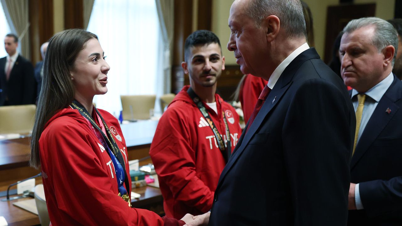 Cumhurbaşkanı Erdoğan, çeşitli branşlardan başarılı sporcularla Cumhurbaşkanlığı Külliyesi'nde görüşme gerçekleştirdi. Görüşmede; İletişim Başkanı Burhanettin Duran, Gençlik ve Spor Bakanı Osman Aşkın Bak ve sporcular yer aldı.