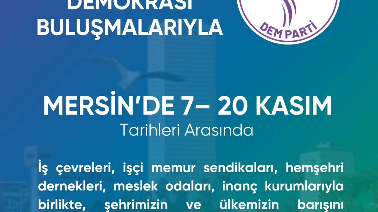 Dem Parti Mersin İl Başkanlığı, Türkiye'de artan siyasi baskılar, ekonomik zorluklar ve toplumsal kutuplaşmaya karşı bir çözüm zemini oluşturmak amacıyla "Barış ve Demokrasi Buluşmaları" adında yeni bir süreci başlattığını açıkladı. Yapılan yazılı açıklamada, mevcut kriz koşullarında toplumsal dayanışma ve ortak mücadele zeminini büyütmenin bir zorunluluk haline geldiği vurgulandı.