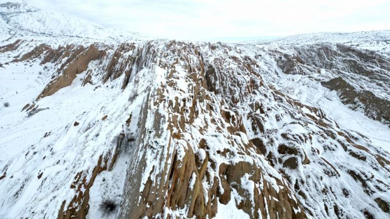 Sivas kent merkezine 25 kilometre mesafedeki yer alan, kızıl görüntüsü ve doğal yapısı ile bilim insanları tarafından Mars yüzeyine benzetilen Eğribucak Kayalıkları, kar yağışı sonrası beyaz örtü ile kaplandı.