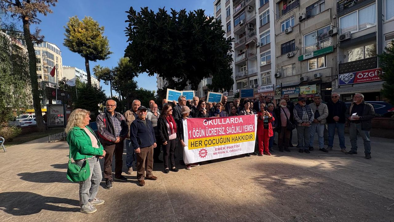 Özgür Çocuk Parkı'nda bir araya gelen EMEP Mersin İl Başkanlığı üyeleri, attıkları sloganlarla tepkilerini dile getirdi. Burada grup adına açıklama yapan Derman Tarancı, 3 yıl önce Kocaeli’nde Ekmek ve Gül Kadın Derneğinin, 'Okullarda 1 öğün ücretsiz, sağlıklı yemek her çocuğun hakkı' diyerek başlattığı kampanyanın ülke geneli kadınların, dernek, meslek örgütü ve sendikaların sahiplenmesiyle önüne geçilmez bir talep haline geldiğini belirterek, "Bu talebi yerine getirmek zorunda kalan Milli Eğitim Bakanlığı, 2022-2023 eğitim-öğretim yılının ikinci yarısında okul öncesi eğitimdeki çocuklara okullarda bir öğün ücretsiz yemek uygulamasını başlattı. Milli Eğitim Bakanlığı, bir dönem süren uygulamayı hiçbir açıklama yapmadan sonlandırdı. Antep Milletvekilimiz Sevda Karaca, 2024 bütçe görüşmelerinde kadınların topladığı ön binlerce imzayı Milli Eğitim Bakanına teslim etmesine rağmen bütçede, okullarda ücretsiz yemeğe yer verilmedi. Esenyalı Kadın Dayanışma Derneği üyesi kadınlar, Danıştay’a başvurarak, çocuklara ücretsiz yemek uygulamasını kaldıran MEB kararının yürütmesinin durdurma kararı verilmesini istediler. Danıştay 8. Dairesi 'kaynaklar kısıtlı' diyerek yürütmeyi durdurma talebini reddedip, 3 Aralık 2025 tarihine duruşma günü verdi. Milli Eğitim Bakanlığı ve savcılık, geniş kesimin talebi olan ‘Okullarda 1 öğün ücretsiz, sağlıklı yemek’ talebine karşılık Danıştay'da yaptığı savunmada 'kaynak olmadığını' ve 'orta ve üst sosyoekonomik düzeye sahip ailelerin okul yemeği istemediğini' söylediler. Saray rejimi ve onun Milli eğitim Bakanlığının çocuklara, okullarda 1 öğün ücretsiz yemek vermek istemediğini gören Danıştay, 4 gün sonra kararını bildirecek. Mersin'den Milli Eğitim Bakanlığına ve Danıştay’a okul yemeğinin, çocukların gelişimi ve eğitimi için neden hayati olduğunu anlatmak isteriz" dedi.