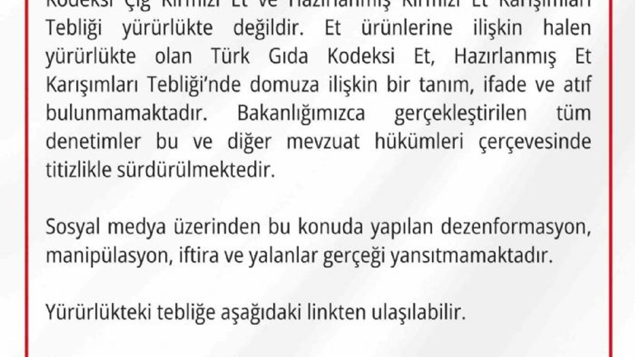 "Bazı sosyal medya hesaplarından 'domuz etinin kasaplık etler sınıfına alındığı' şeklinde dolaşıma sokulan Türk Gıda Kodeksi Çiğ Kırmızı Et ve Hazırlanmış Kırmızı Et Karışımları Tebliği yürürlükte değildir. Et ürünlerine ilişkin halen yürürlükte olan Türk Gıda Kodeksi Et, Hazırlanmış Et Karışımları Tebliği'nde domuza ilişkin bir tanım, ifade ve atıf bulunmamaktadır. Bakanlığımızca gerçekleştirilen tüm denetimler bu ve diğer mevzuat hükümleri çerçevesinde titizlikle sürdürülmektedir. Sosyal medya üzerinden bu konuda yapılan dezenformasyon, manipülasyon, iftira ve yalanlar gerçeği yansıtmamaktadır."