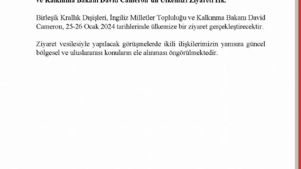 Dışişleri Bakanlığından yapılan yazılı açıklamada, Birleşik Krallık Dışişleri, İngiliz Milletler Topluluğu ve Kalkınma Bakanı David Cameron'un 25-26 Ocak tarihleri arasında Türkiye'ye bir ziyaret gerçekleştireceği belirtildi. Ziyaret çerçevesinde yapılacak görüşmelerde ikili ilişkilerin yanı sıra güncel bölgesel ve uluslararası konuların ele alınacağı kaydedildi.