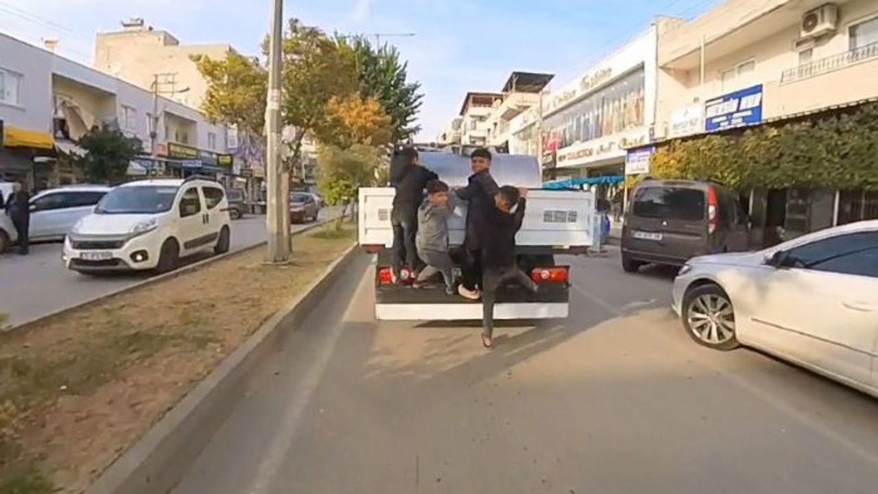 Mersin'in merkez Akdeniz ilçesinde 4 çocuğun bir kamyonetin arkasına tutunarak yaptığı tehlikeli yolculuk, cep telefonu kamerasına yansıdı. Trafikte bulunan bir motosiklet sürücüsünün kamerasına yansıyan görüntülerde çocuklardan biri, hızla ilerleyen aracın arkasına tutunurken bir an için inmek istedi. Bir ayağını yere indiren çocuk, inemeyeceğini fark edince son anda tekrar tutundu. Motosiklet sürücüsünün uyarılarına rağmen çocuklar tehlikeyi görmezden gelerek yolculuklarına devam etti.