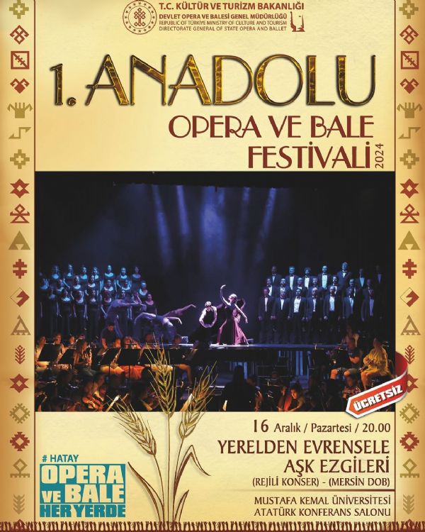 16 Aralık Pazartesi 20.00'da da Yerelden Evrensele - Aşk Ezgileri konseri verecek. MDOB'un Hatay'daki etkinlikleri, Hatay Mustafa Kemal Üniversitesi Atatürk Konferans Salonu'nda gerçekleşecek.