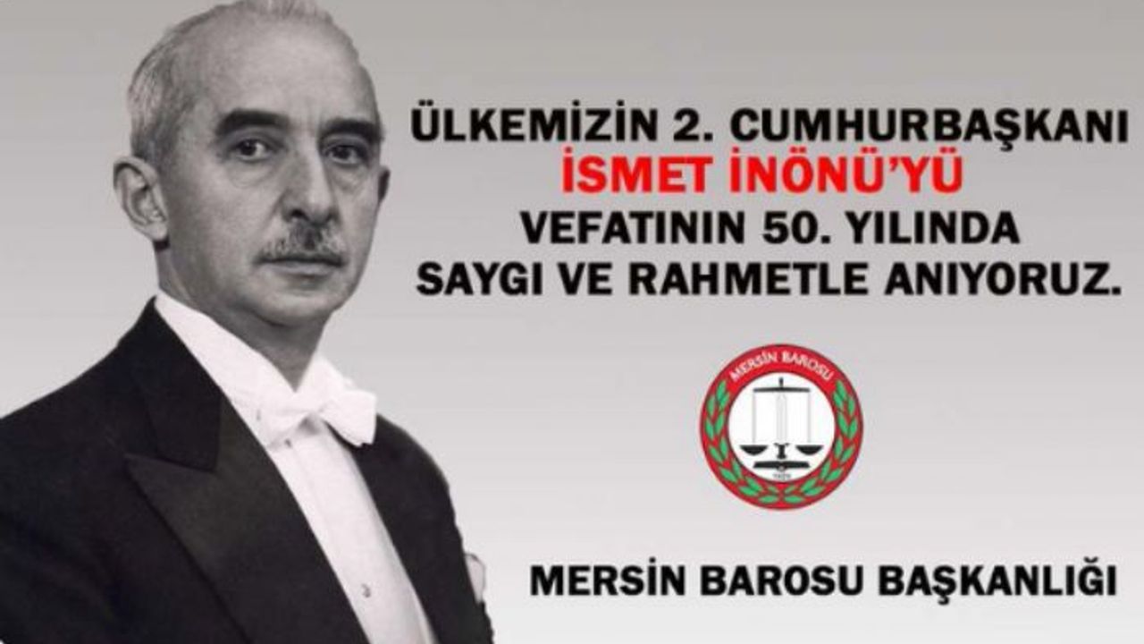 Mersin Barosu sosyal medya hesabında anma mesajını "Türkiye Cumhuriyeti Devleti'nin ikinci Cumhurbaşkanı, Kurtuluş Savaşı'mızın kahramanı İsmet İnönü'yü vefatının 50. yılında bir kez daha saygı, minnet ve rahmetle anıyoruz" notuyla paylaştı.