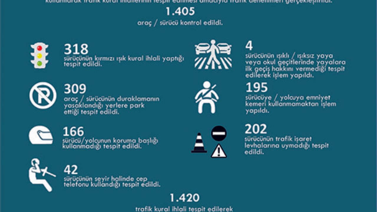 Trafik güvenliği ve kontrolünün sağlanması amacıyla Mersin'de toplumun ortak kullanım alanlarını, cadde, sokak, kavşak ve stratejik yerlerin gün boyu izlenmesi ve takip edilmesi esasına dayanarak işleyen Kent Güvenlik Yönetim Sistemi (KGYS) ile trafik kural ihlallerinin tespit edilmesi amacıyla 1 Temmuz-19 Ağustos 2022 tarihleri arasında yapılan trafik denetimlerinde; 318 sürücünün kırmızı ışık kuralını ihlal ettiği, 42 sürücünün seyir halinde cep telefonu kullandığı, 309 araç / sürücünün duraklamanın yasak olduğu yerlere park ettiği, 195 sürücü / yolcunun emniyet kemeri kullanmadığı, 166 sürücü / yolcunun koruma başlığı kullanmadığı, 202 sürücünün trafik işaretleri levhalarına uymadığı, 4 araç sürücüsünün ışıklı / ışıksız yaya veya okul geçitlerinde yayalara ilk geçiş hakkını vermediği tespit edilerek işlem yapıldı. Toplam bin 420 trafik kuralı tespit edilerek cezai işlem uygulandı. Ayrıca; aynı tarih aralığında sivil trafik ekipleri tarafından daha önceden belirlenen uygulama alanlarında yapılan denetim sonucunda; 2 bin 625 toplu taşıma aracına, 6 bin 617 elektrikli bisiklet / motosiklet sürücüsüne cezai işlem uygulandı. 13 bin 866 araç / sürücünün hız ihlali yaptığı, 4 bin 616 sürücünün seyir halinde cep telefonu kullandığı, 2 bin 987 sürücünün belgesiz olarak araç kullandığı, bin 179 sürücünün alkol etkisinde araç kullandığı ve sürücü belgesinin geçici olarak geri alındığı tespit edilmiştir. (Haber Merkezi)