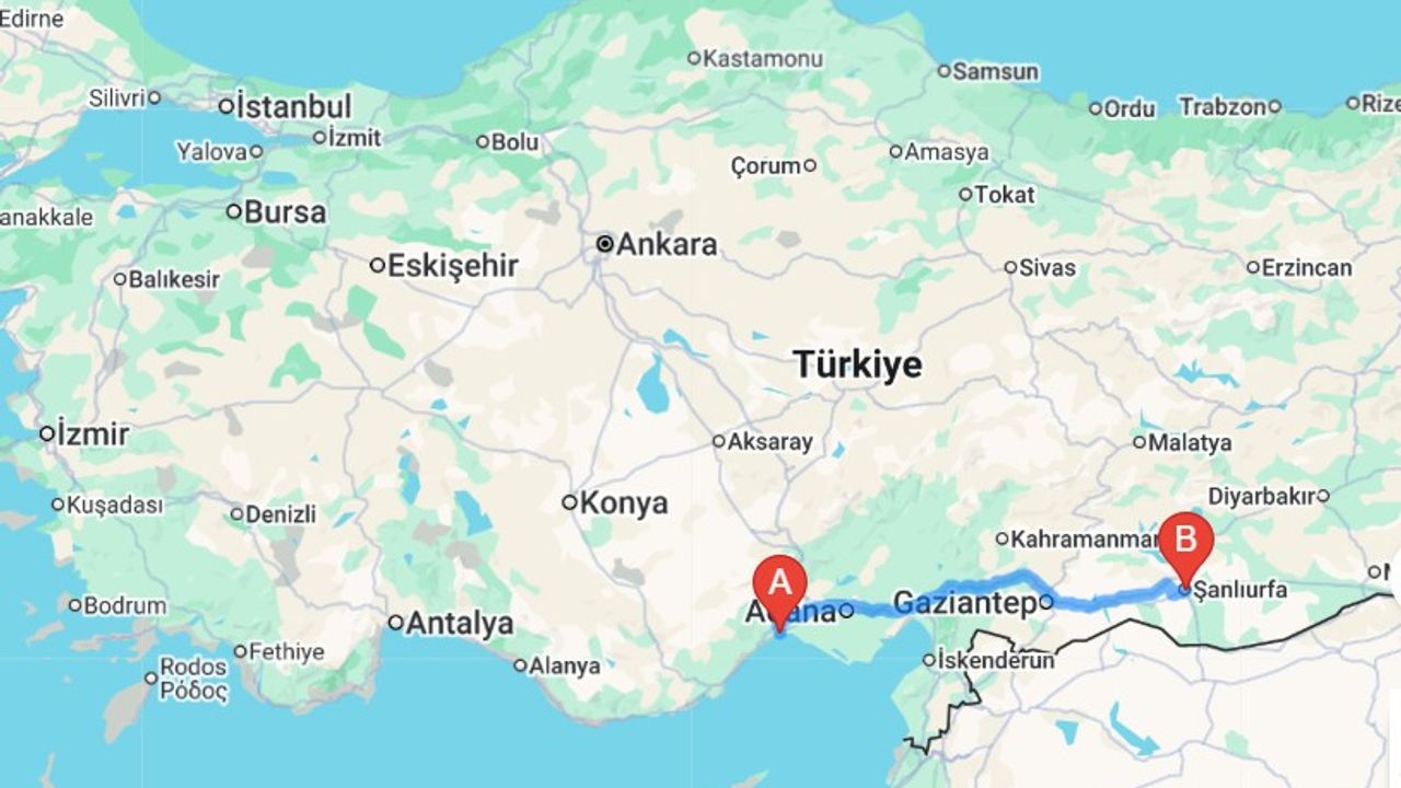 Mersin ile Şanlıurfa arasındaki karayolu mesafesi ve tahmini yolculuk süresi şu şekildedir: