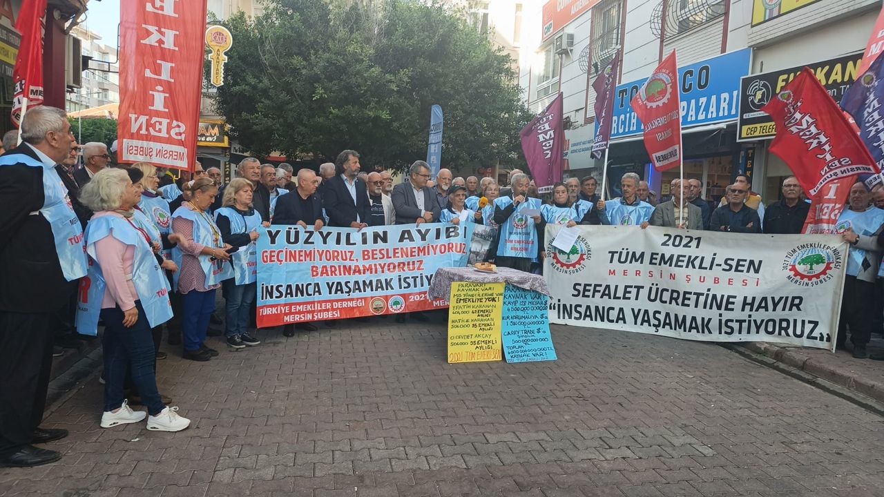 2021 Tüm Emekliler Sendikası Mersin Şubesi önünde bir araya gelen emekli vatandaşlar, "geçinemiyorum" eylemi yaparak, 6 Aralık'ta gerçekleştirilecek büyük mitinge çağrı yaptı. Burada emekliler adına açıklama yapan Hüseyin Kurt, Mersin'de son emekliye ulaşana kadar durmadan çalışmaya devam edeceklerini belirterek, "Biliyoruz ki; gücümüz birliğimizden gelir. Yıllardır açlık sınırının altında yaşayan milyonlarca emeklinin mutfağındaki yangının sönmesi, tenceresinin kaynaması ve karnının doyması için 'insanca yaşanabilecek maaşı siz vermiyorsanız biz alacağız' demenin şimdi tam zamanıdır, Artık söz bitti. Şimdi karar verme ve harekete geçme zamanı. Ya köle olacağız ya insanca yaşayacağız. Biz istemezsek vermeyecekler, haydi hep birlikte ortak ve birleşik mücadeleye. İnanın, ele ele ve omuz omuza birlikte mücadele etmeyi başarabilirsek; emeklilerin sendikal haklarını özgürce kullanabileceği, huzur ve güven içerisinde insanca yaşayabileceği günlere mutlaka kavuşacağız. Sendikalı ve sendikasız bütün emekli yurttaşları, Yurttaş Birlikteliği öncülüğünde 6 Aralık Cumartesi günü Ankara Tandoğan Anadolu Meydanı'nda düzenlenen "Emeklilerin Bütçe Hakkı Mitingine" katılmak amacıyla, saat 11.00'de Atatürk Kültür Merkezi önünde, 2021 Tüm Emekliler Sendikası kortejinde buluşmaya davet ediyoruz" dedi.