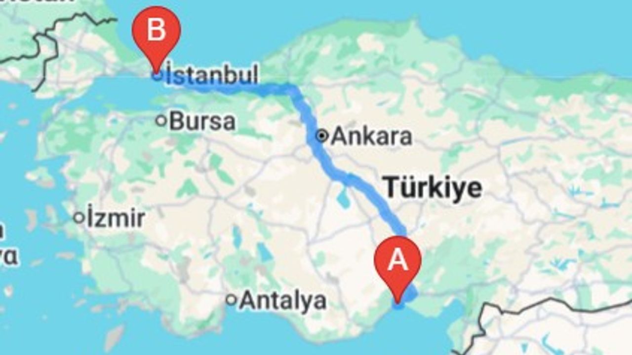 Yapılan navigasyon verilerine göre, Mersin ile İstanbul arasındaki en yaygın ana güzergâh karayolu ile:
