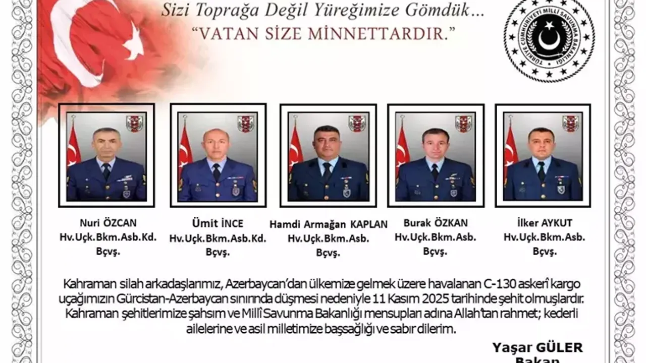 Milli Savunma Bakanlığı (MSB), Gürcistan-Azerbaycan sınırında bir C-130 askeri kargo uçağının düşmesi sonucu 20 askerin şehit olduğunu açıkladı. Uçak, Azerbaycan’dan Türkiye’ye dönüş uçuşundayken kaza yaptı.