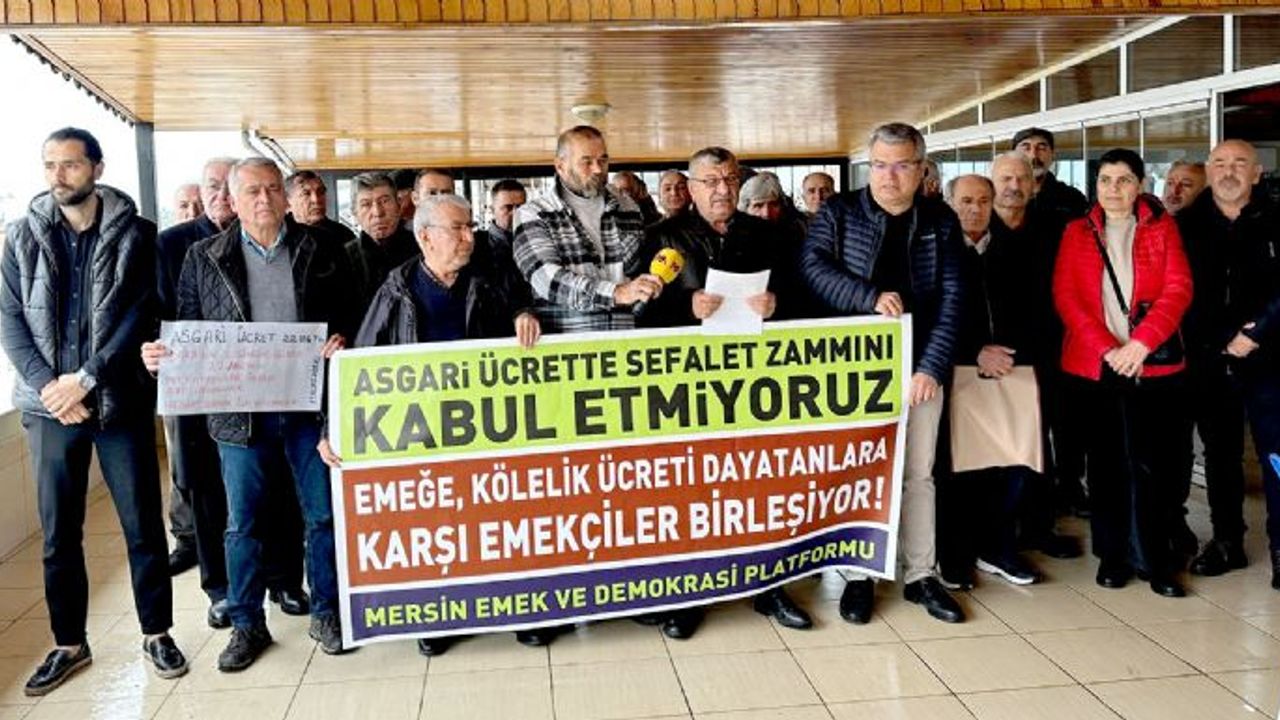 Mersin Emek ve Demokrasi Platformu üyeleri, Eğitim Sen binasında yaptıkları açıklamada; 2025 yılı için açıklanan 22 bin 104 liralık asgari ücrete tepki gösterdi.