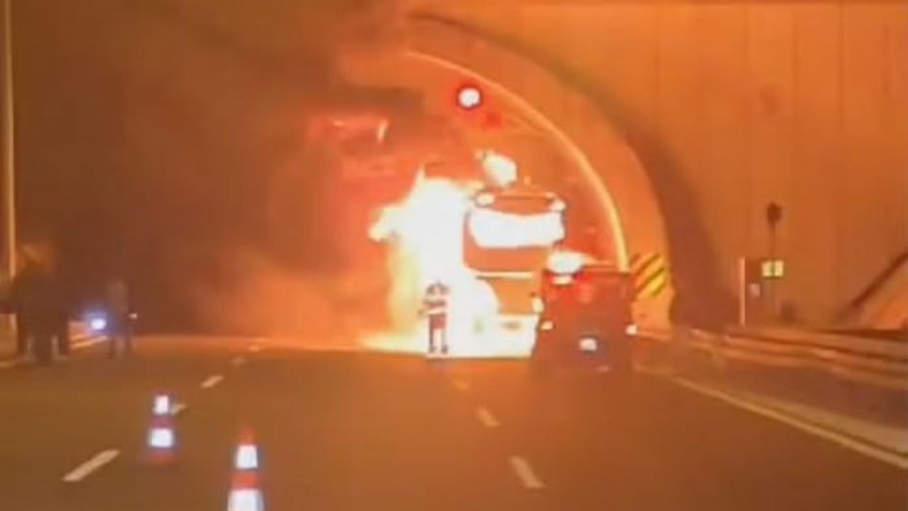 Alevleri fark eden otobüs şoförü aracı sağ şeride çekip, 39 yolcuyu tahliye etti. Kısa sürede otobüsü alev topuna çeviren yangın kameraya yansırken, ihbar üzerine bölgeye çok sayıda itfaiye, sağlık ve polis ekibi sevk edildi. İtfaiye ekiplerince yangın söndürülürken, otobüs hurdaya döndü.