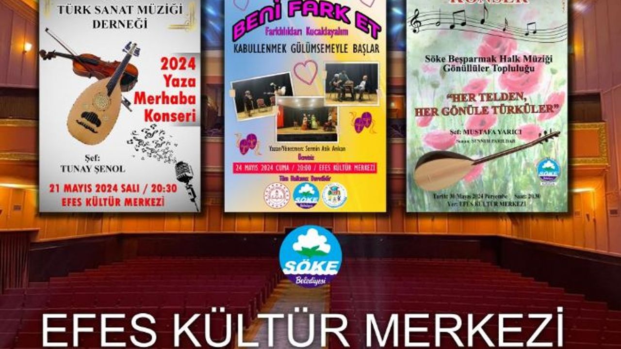 Şefliğini Tunay Şenol'un yaptığı Söke Türk Sanat Müziği Derneği Korosu, yaz konserini 21 Mayıs 2024 Salı günü gerçekleştirecek. Konser saat 20.30'da başlayacak. İçinde bulunduğumuz Engelliler Haftası nedeniyle, farkındalık oluşturmak üzere gerçekleştirilecek tiyatro gösterimi 24 Mayıs 2024 Cuma günü saat 20.00'de gerçekleşecek. Sermin Atik Arıkan'ın yazıp, yönettiği 'Beni Fark Et' adlı oyun izleyicilerle buluşacak. Diğer taraftan 30 Mayıs 2024 Perşembe günü, Beşparkmak Türk Halk Müziği Topluluğu sevilen eserleri seslendirecek. Şefliğini Mustafa Yarıcı'nın yaptığı koro 'Her telden, her gönüle türküler' adlı konseriyle Sökelilerle buluşacak.